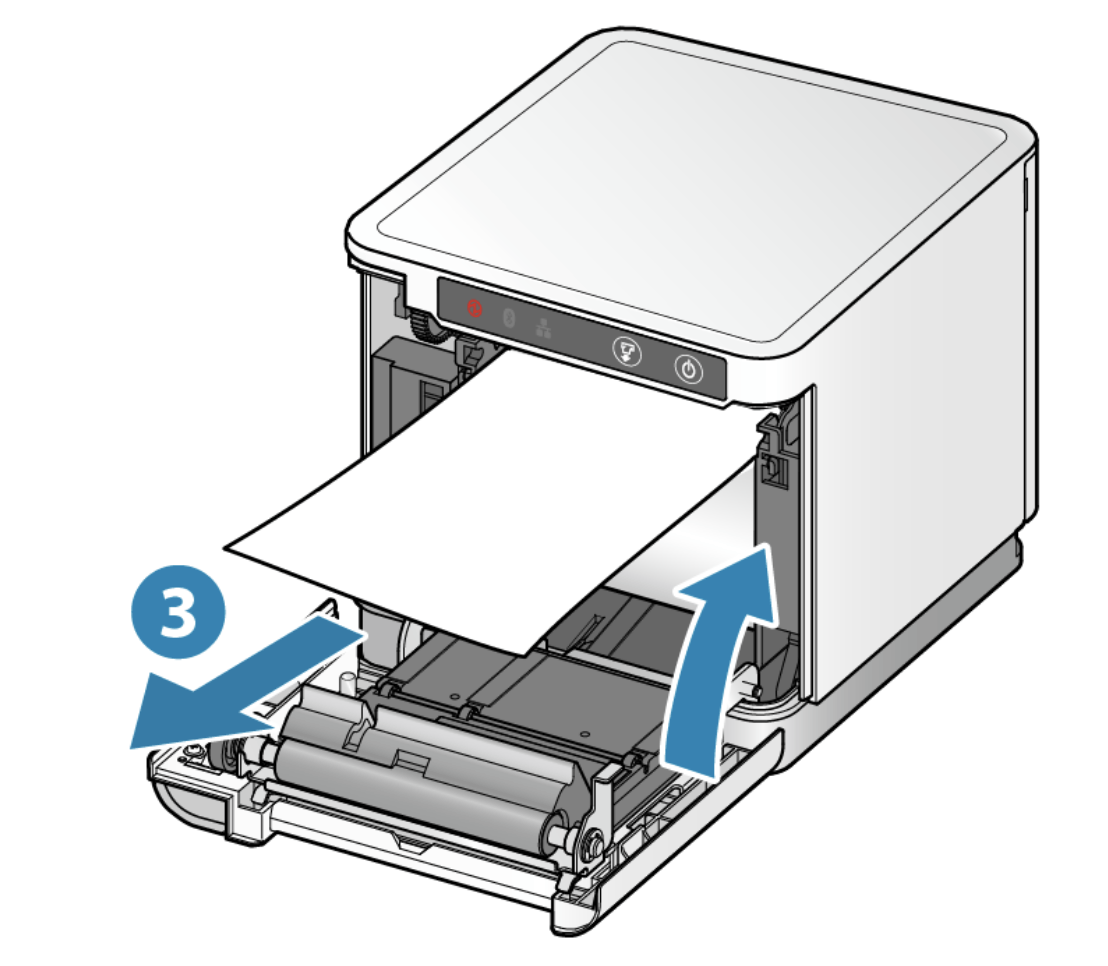 Sur la face avant de l'imprimante, vous pouvez voir un gros bouton en haut à gauche. Posez le doigt au-dessus du bouton, puis tirez vers vous et vers le bas, comme sur le schéma ci-dessous :